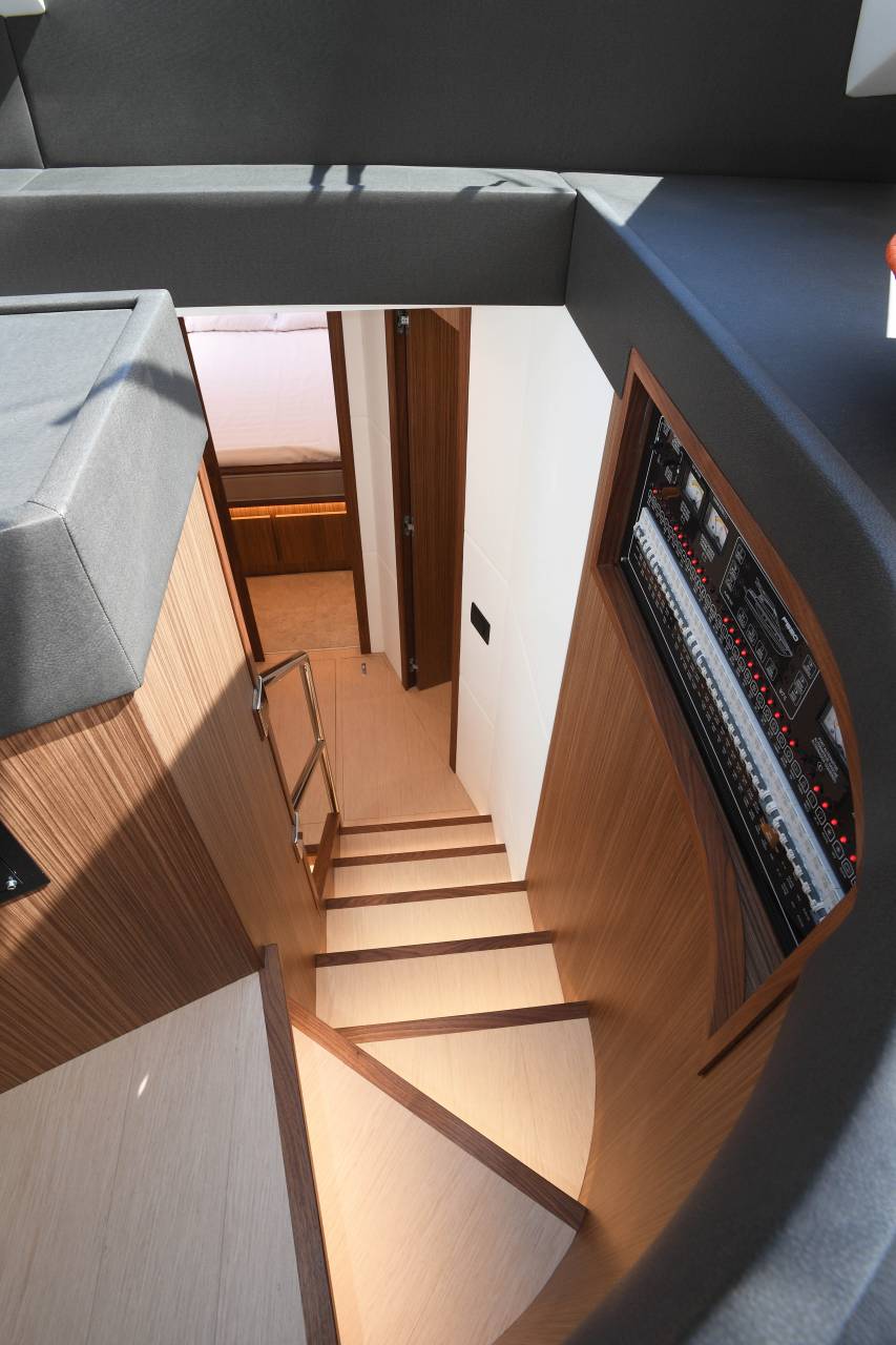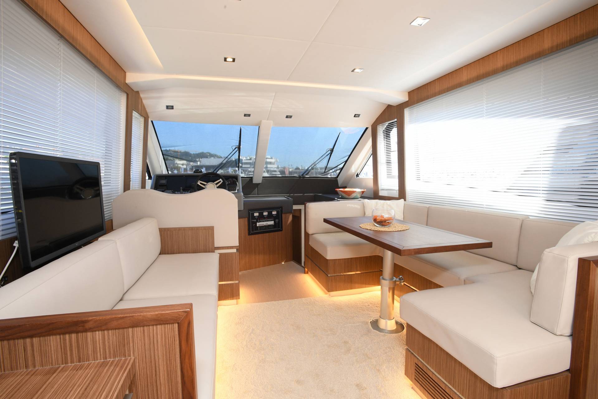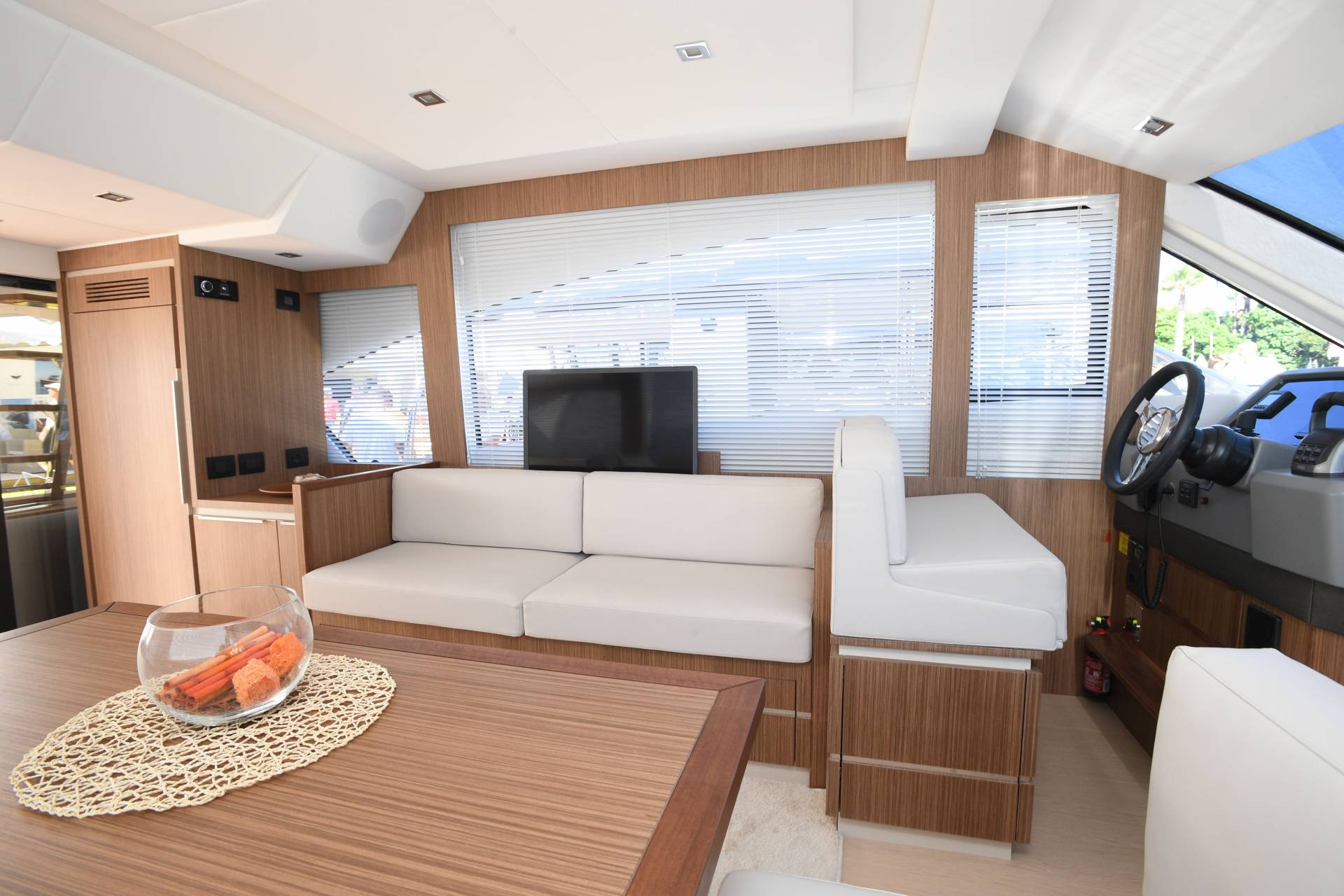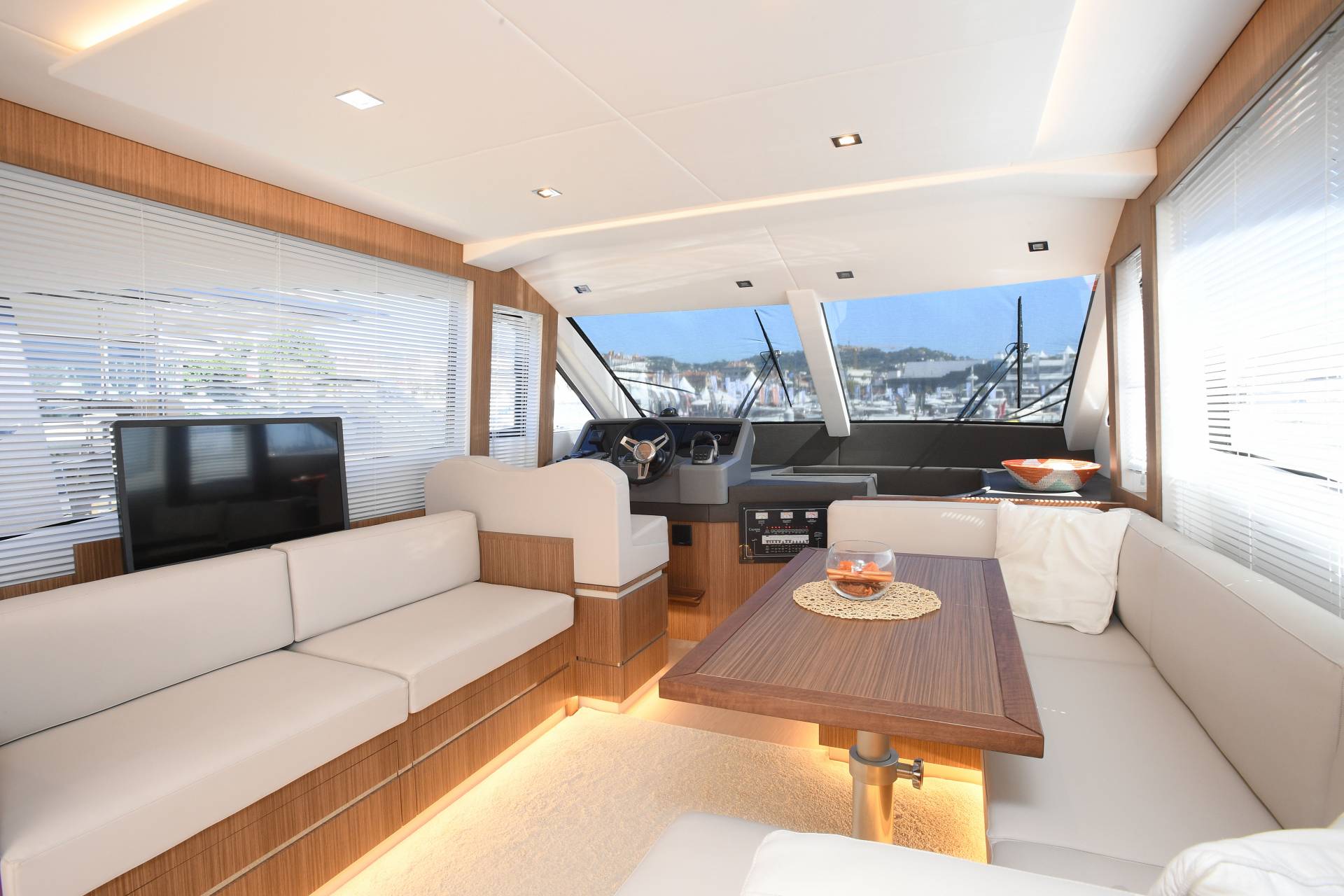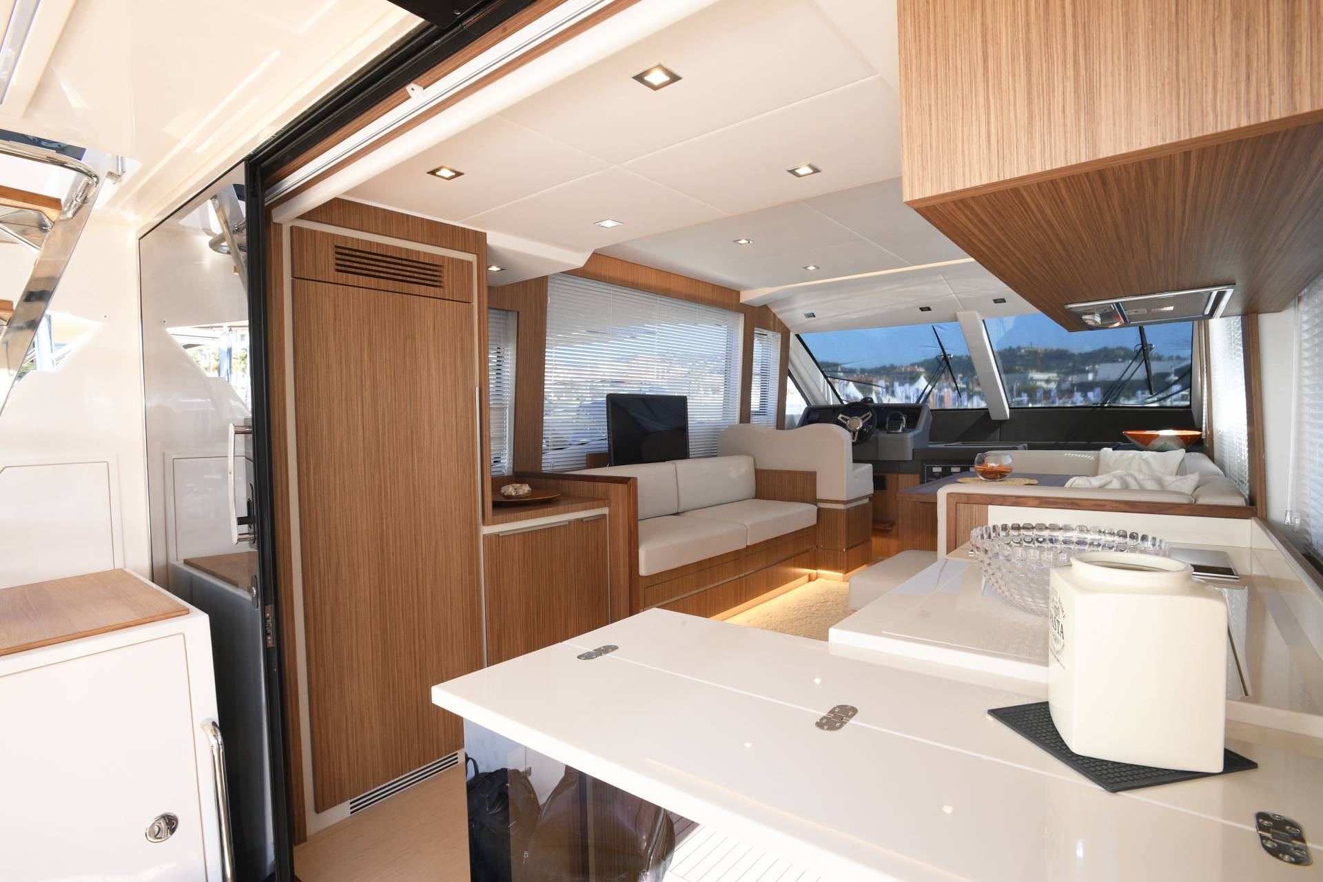 The interior of the F520 blends natural light, refined materials, and thoughtful ergonomics for restful living at sea or in port.