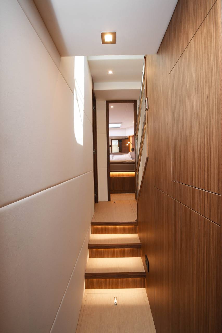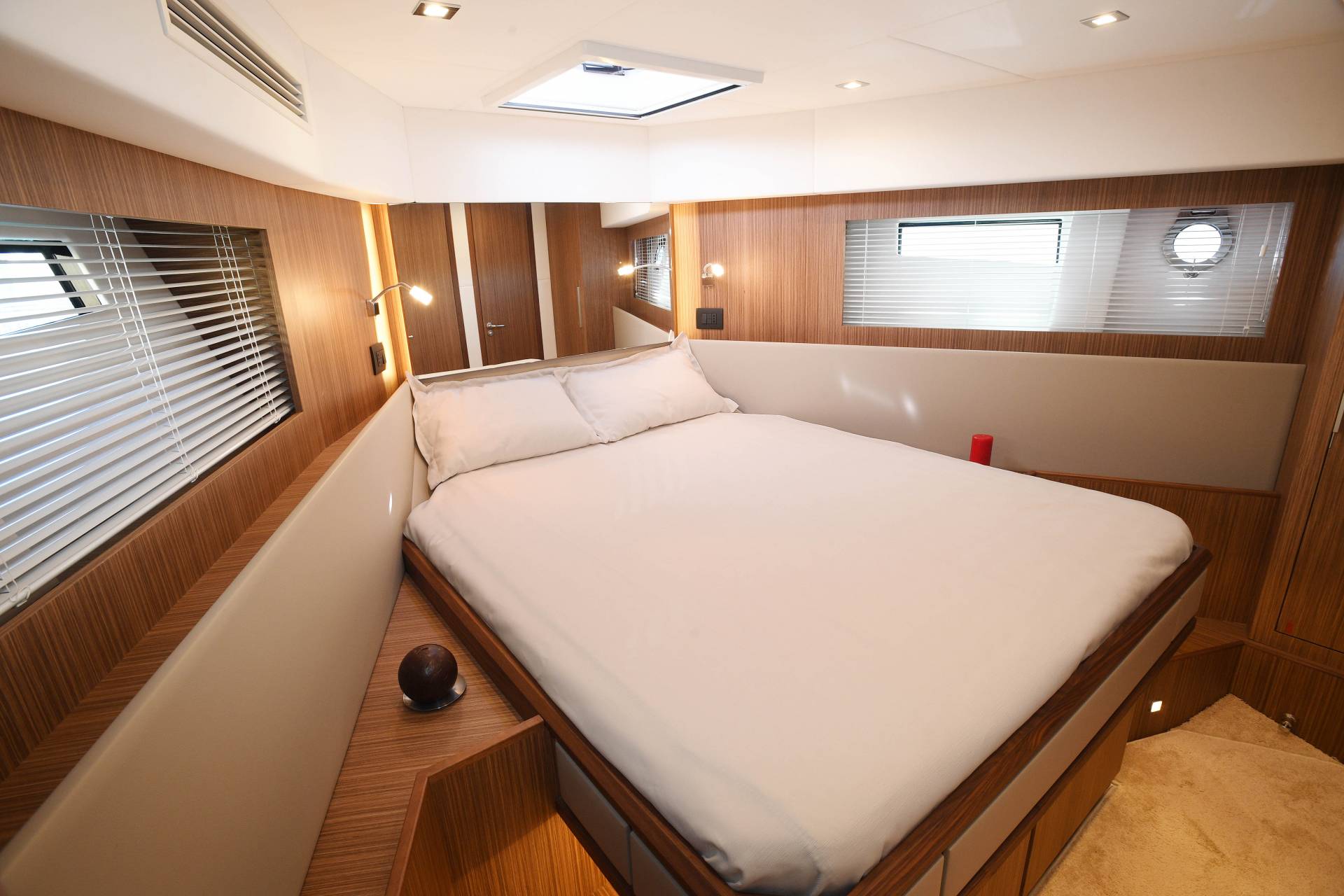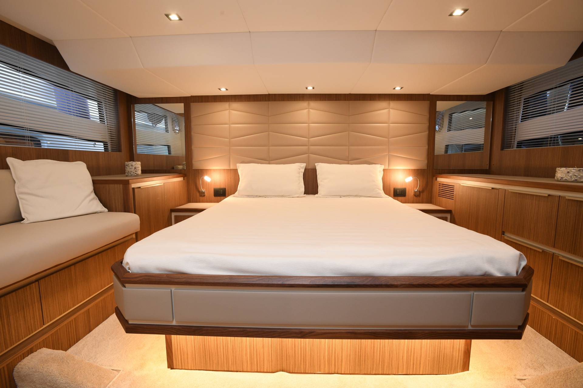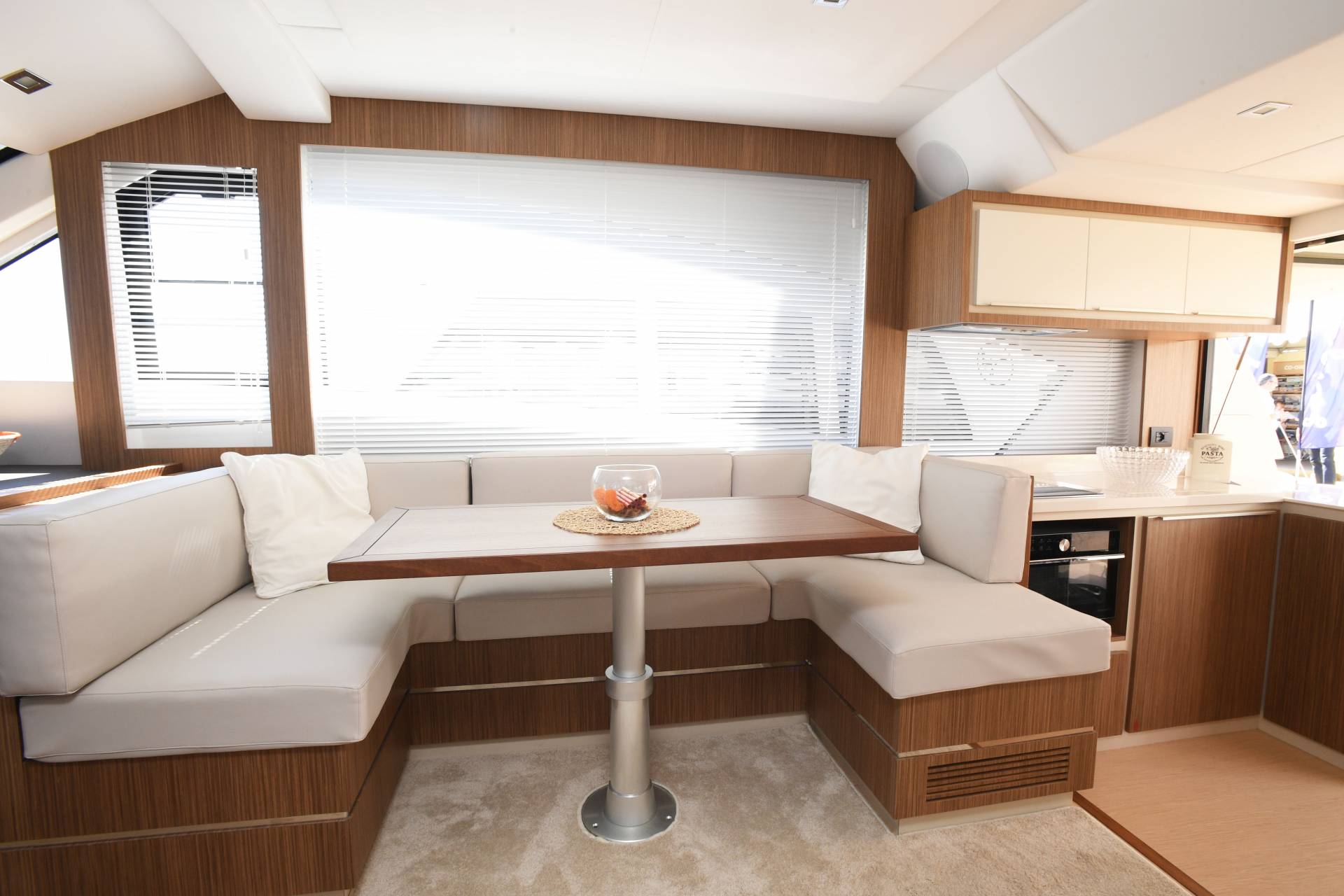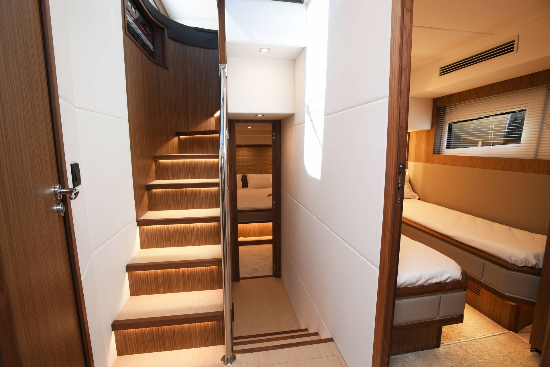 The interior of the F520 blends natural light, refined materials, and thoughtful ergonomics for restful living at sea or in port.