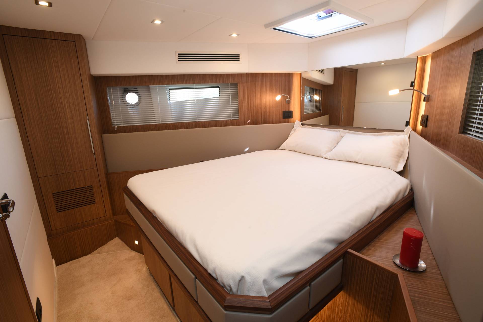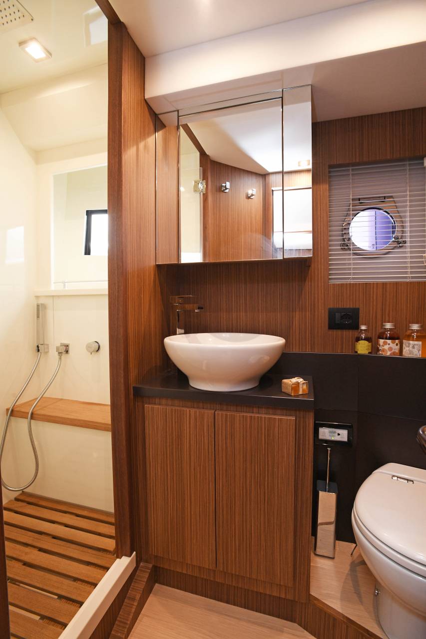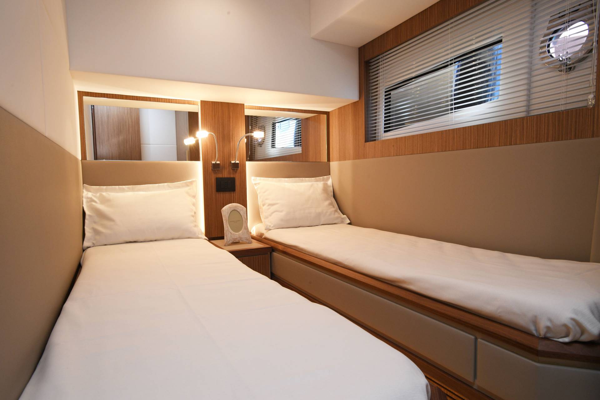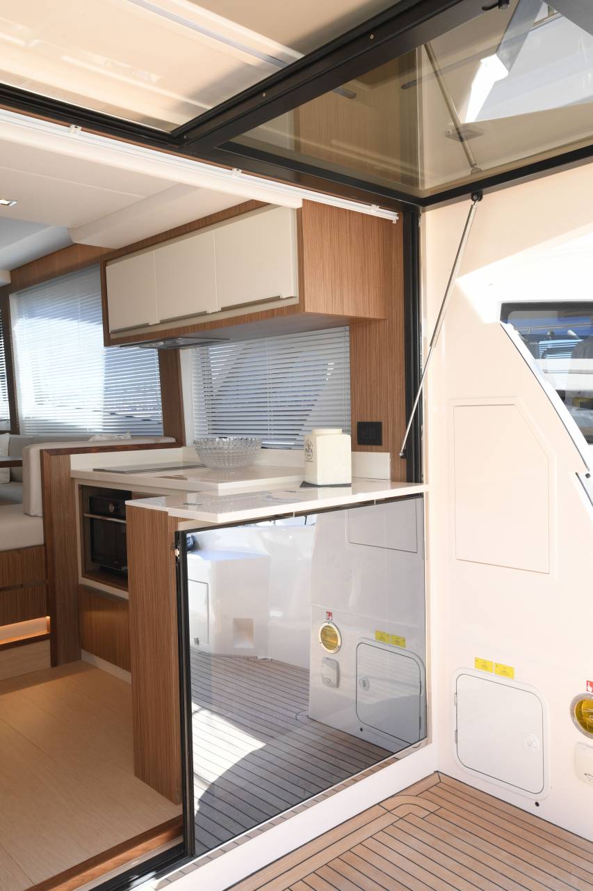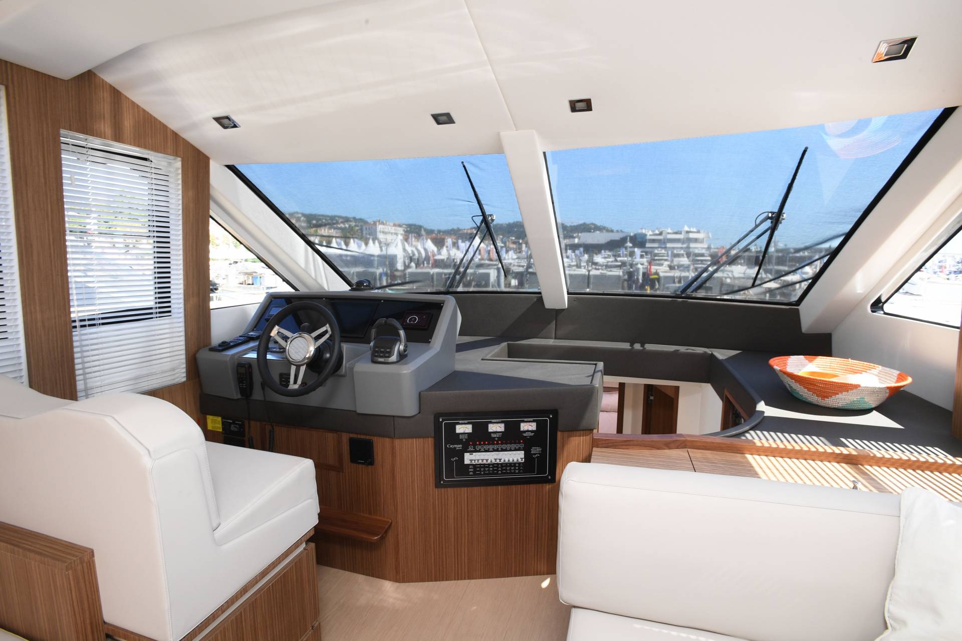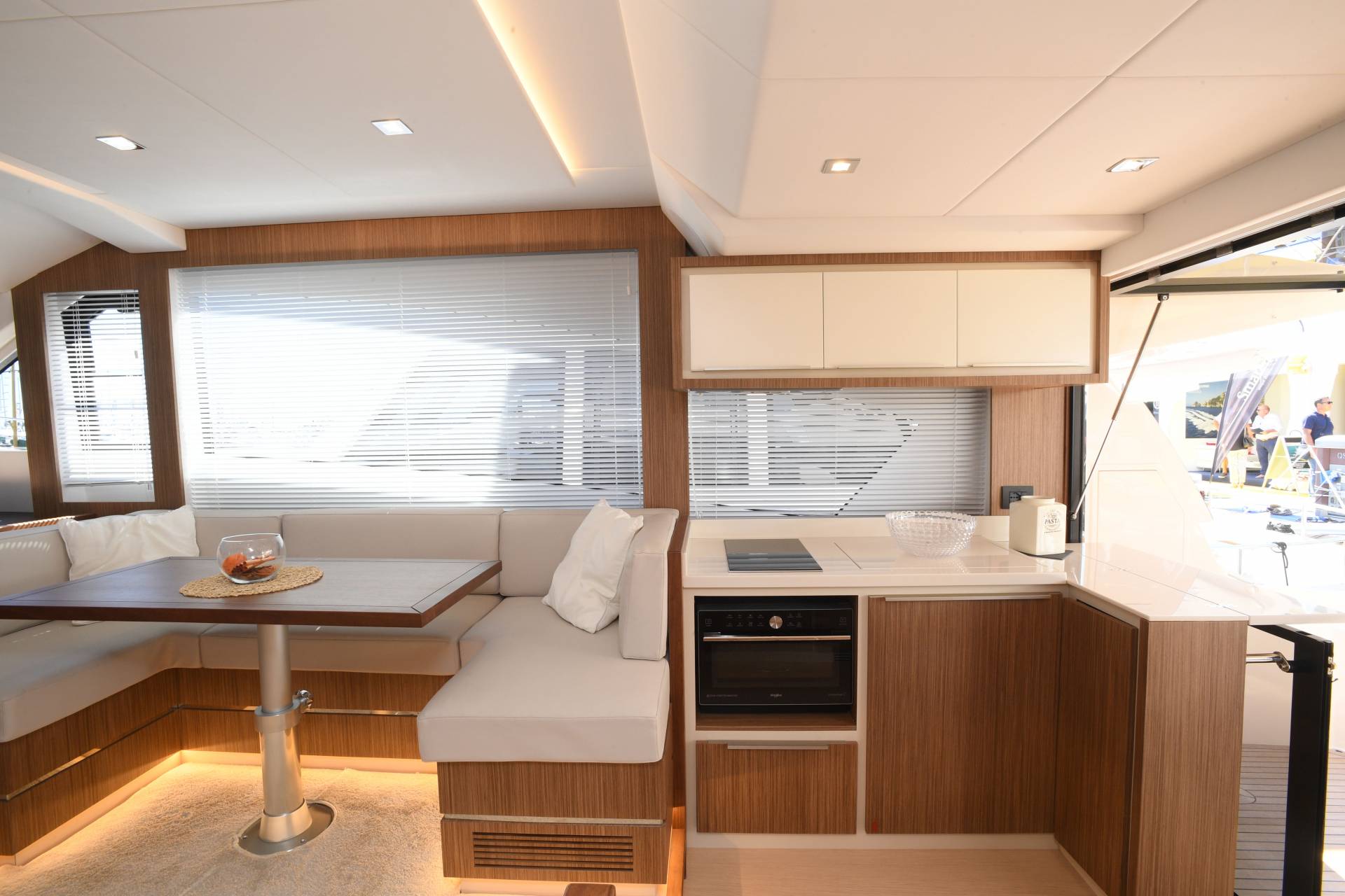 The interior of the F520 blends natural light, refined materials, and thoughtful ergonomics for restful living at sea or in port.