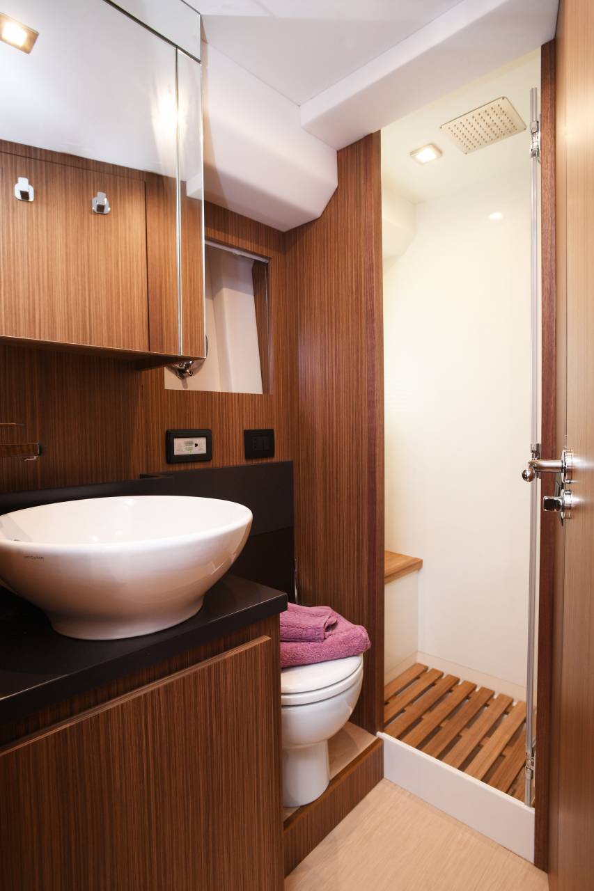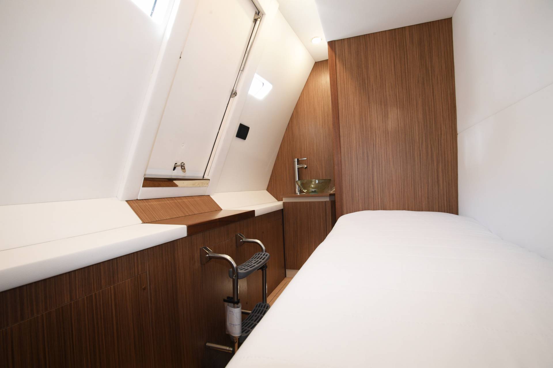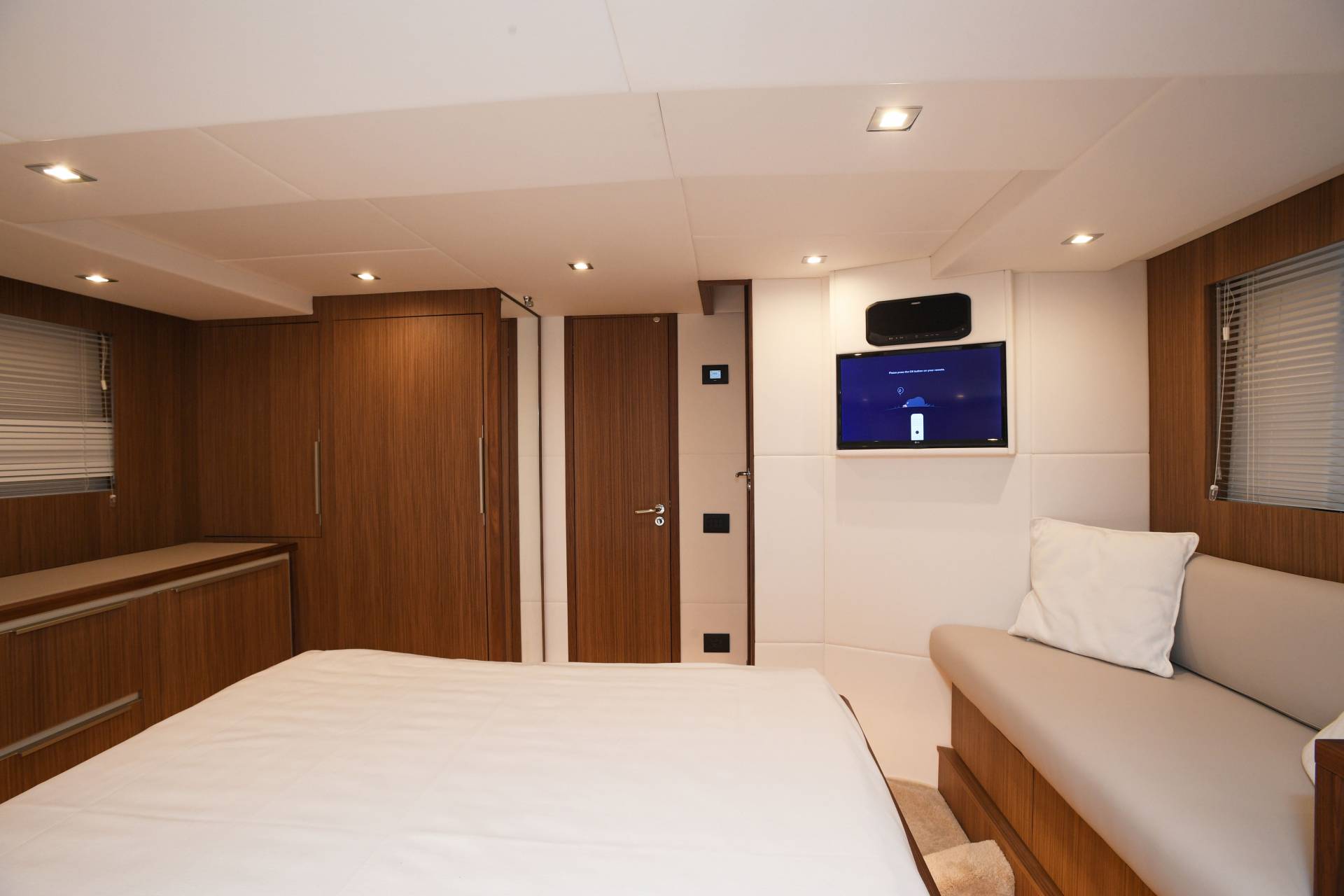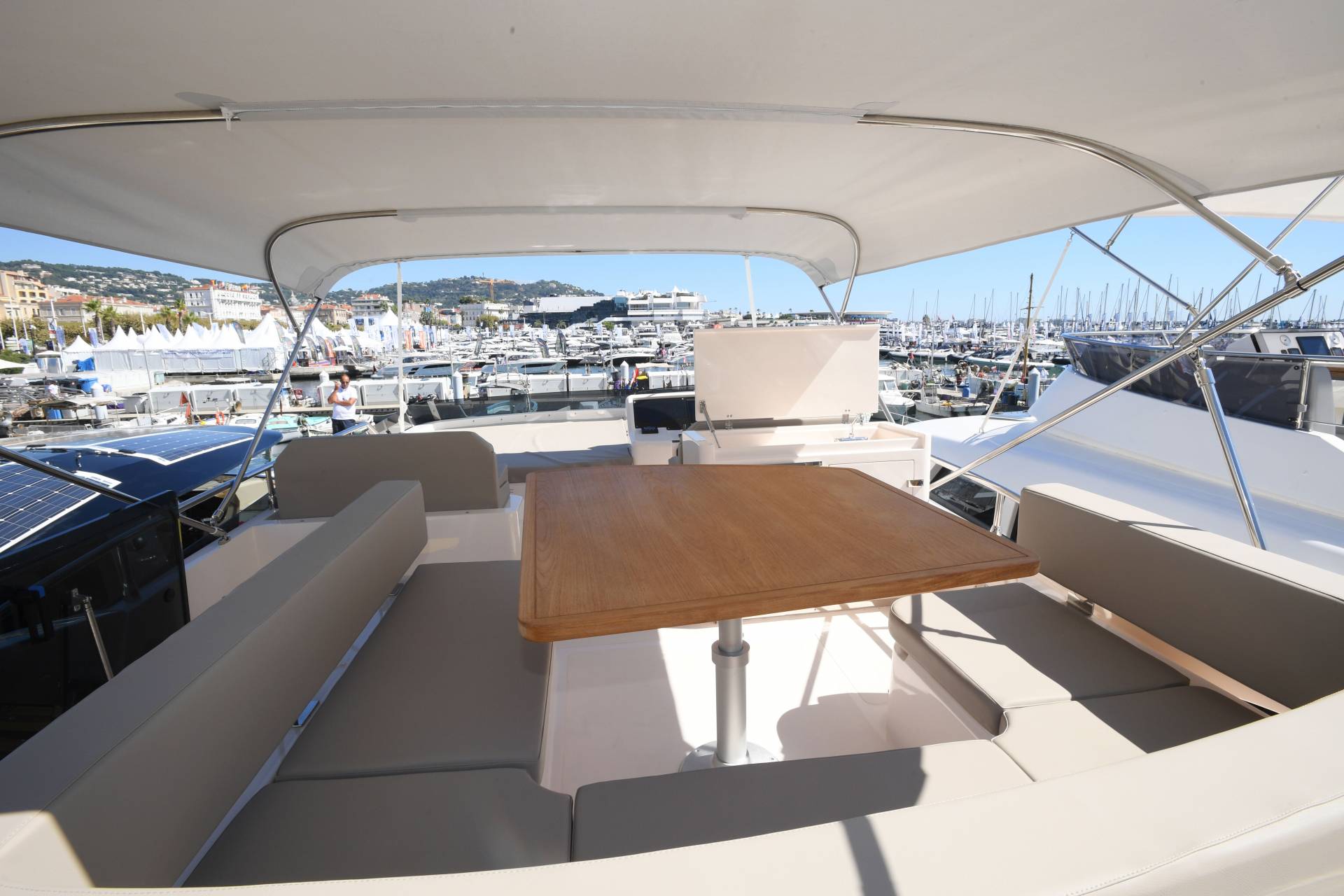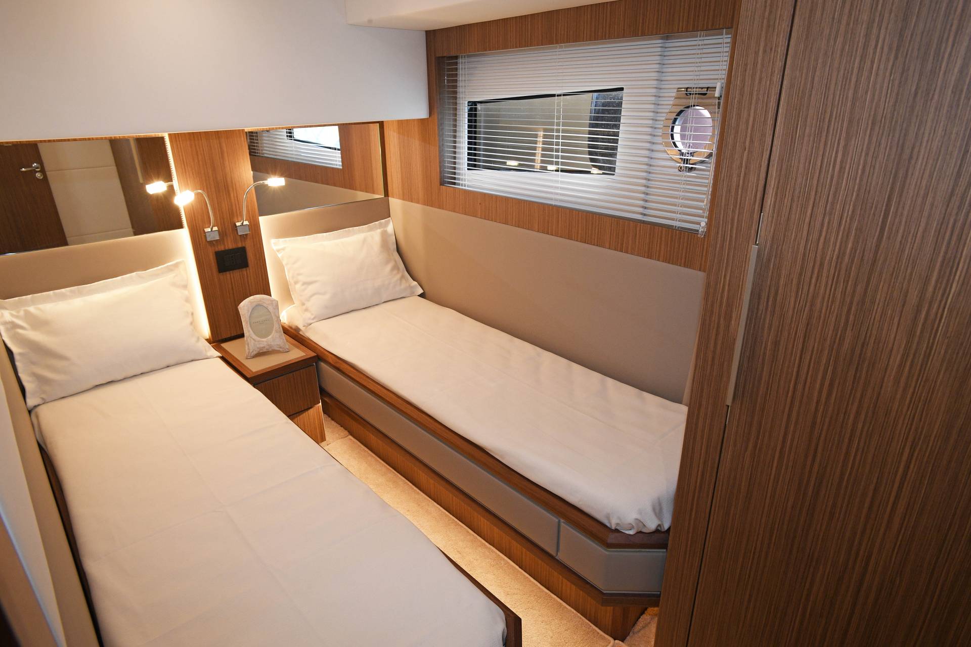 The interior of the F520 blends natural light, refined materials, and thoughtful ergonomics for restful living at sea or in port.